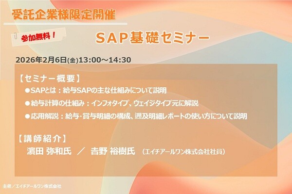 本セミナーは弊社受託企業様限定とさせていただいております。 参加申込み用URLにつきましては、 各社人事様宛にご案内しておりますので そちらからお申込みいただきますようお願いいたします。 |