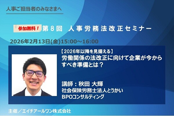 下記リンク先の申込フォームより、ご登録お願いします。 法改正に向けて、企業に必要な準備を解説!『人事労務法改正セミナー』 URL:https://zoom.us/webinar/register/WN_a3qaB11URO6sFHsVHdKsmA |